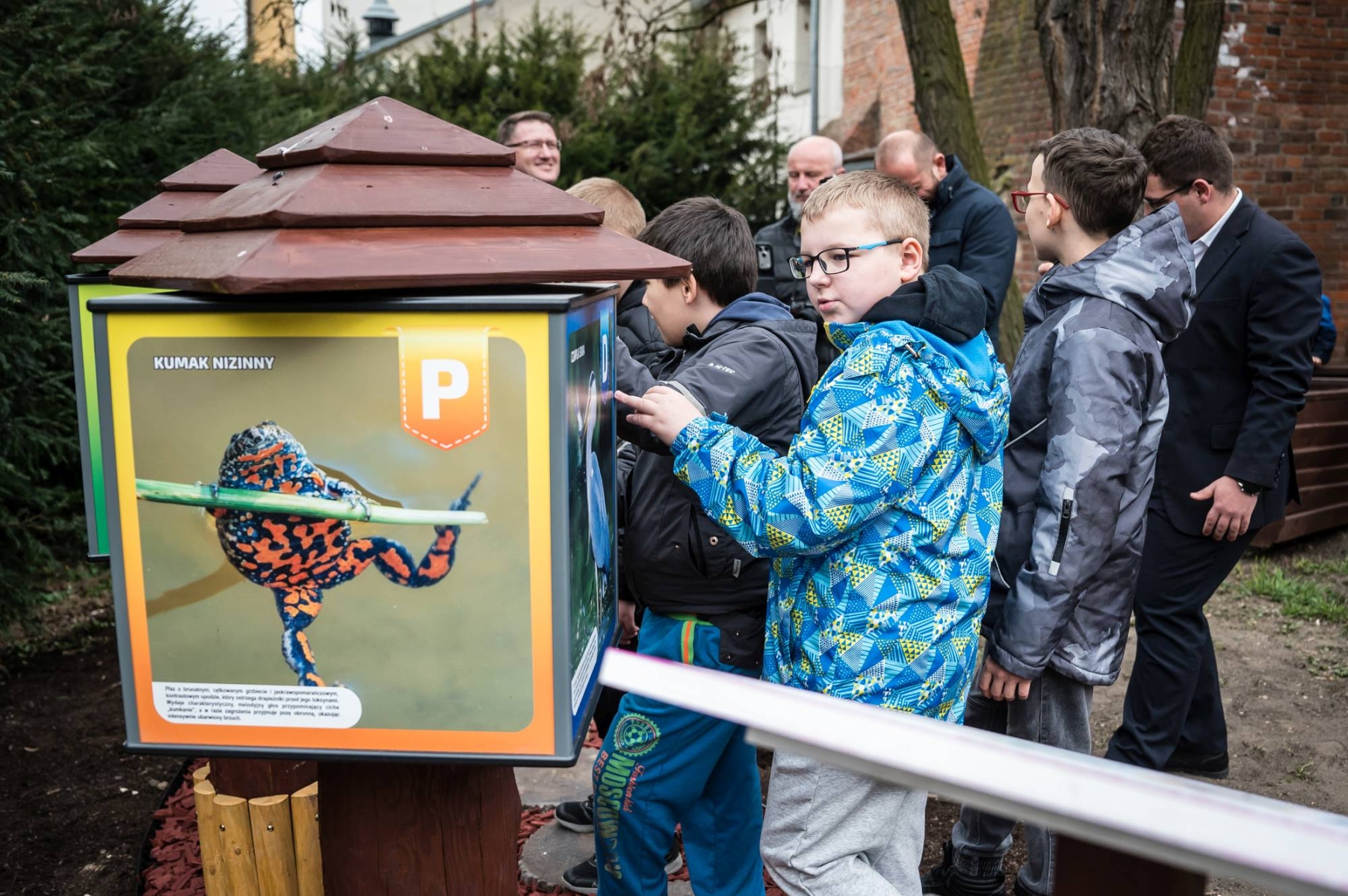 Uzupełnieniem są tzw. giga kostki – duże, obrotowe sześciany osadzone na drewnianych podstawach. Ich powierzchnie wypełniono grafikami oraz treściami przyrodniczymi, tworząc spójny system edukacyjny o charakterze interaktywnym.